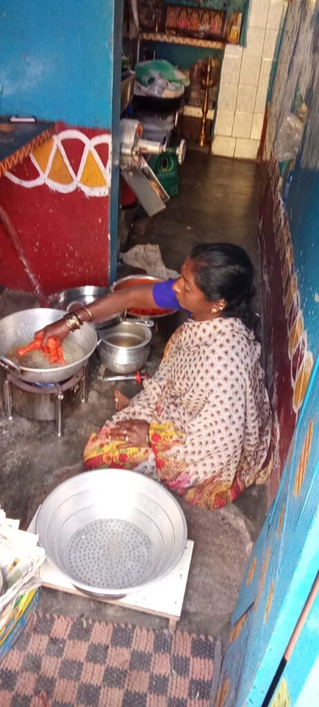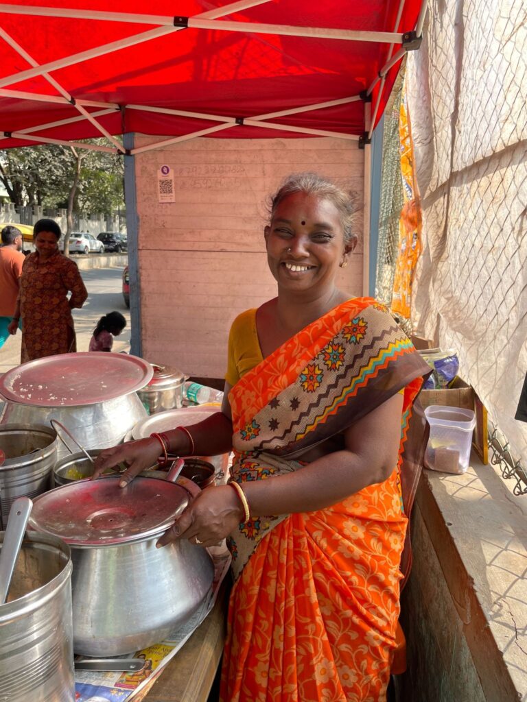 For instance, when the Udhyam team started working with Jeeva they identified practical gaps like not having the vessels to cook in larger quantities. We provided her with larger cooking equipment and with that additional equipment, her capacity increased. We also helped her secure her FSSAI license, improve hygiene and presentation of her stall, and with a small monetary support from Udhyam, she set up a simple canopy and seating to make her stall weather-proof and welcoming.