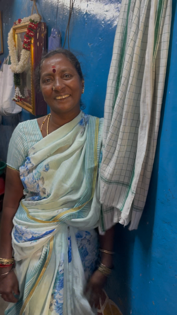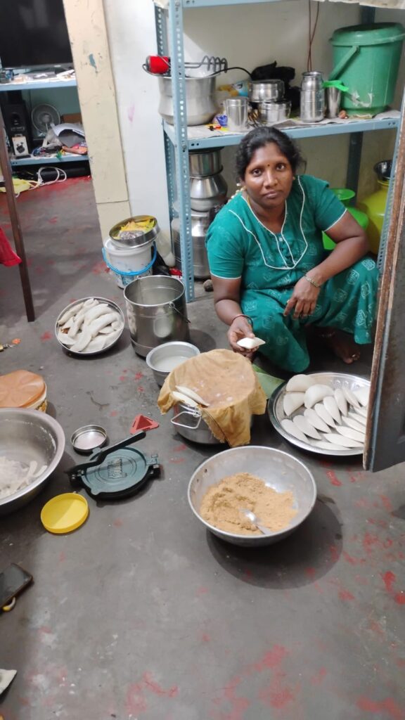 This is visible in entrepreneurs like Sathya. Always looking for ways to grow, she introduced chicken kebabs to her shop’s offerings, initially cooking on firewood. But with the Udhyam team’s financial support, she transitioned to a stove, improving safety and efficiency. The team also helped fix her old dosa batter machine, allowing her to produce and sell nearly six kilograms of batter each week. She also invested in a second-hand fridge with partial support from Udhyam, to store the dosa batter and ingredients for her shop.